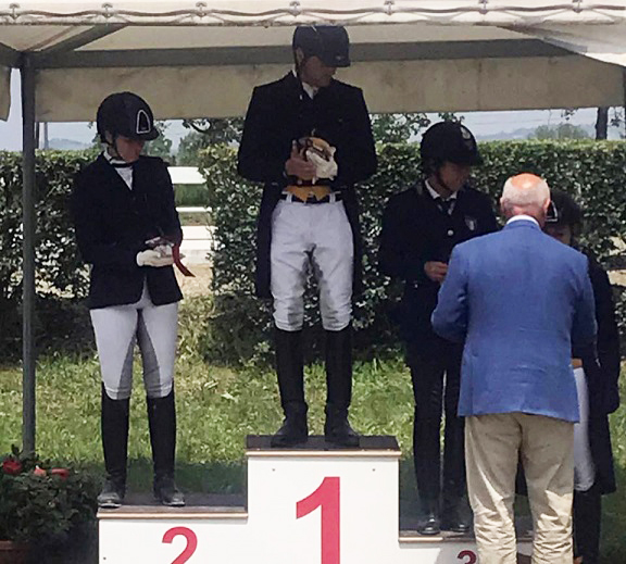 Podio del Prix St Georges di domenica con Stefano Mantica sul gradino più alto con a sinistra Nadja Meuter seconda ed a destra Ester Soldi terza (photo courtesy: Roncobello Dressage).