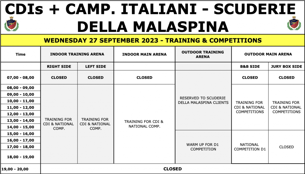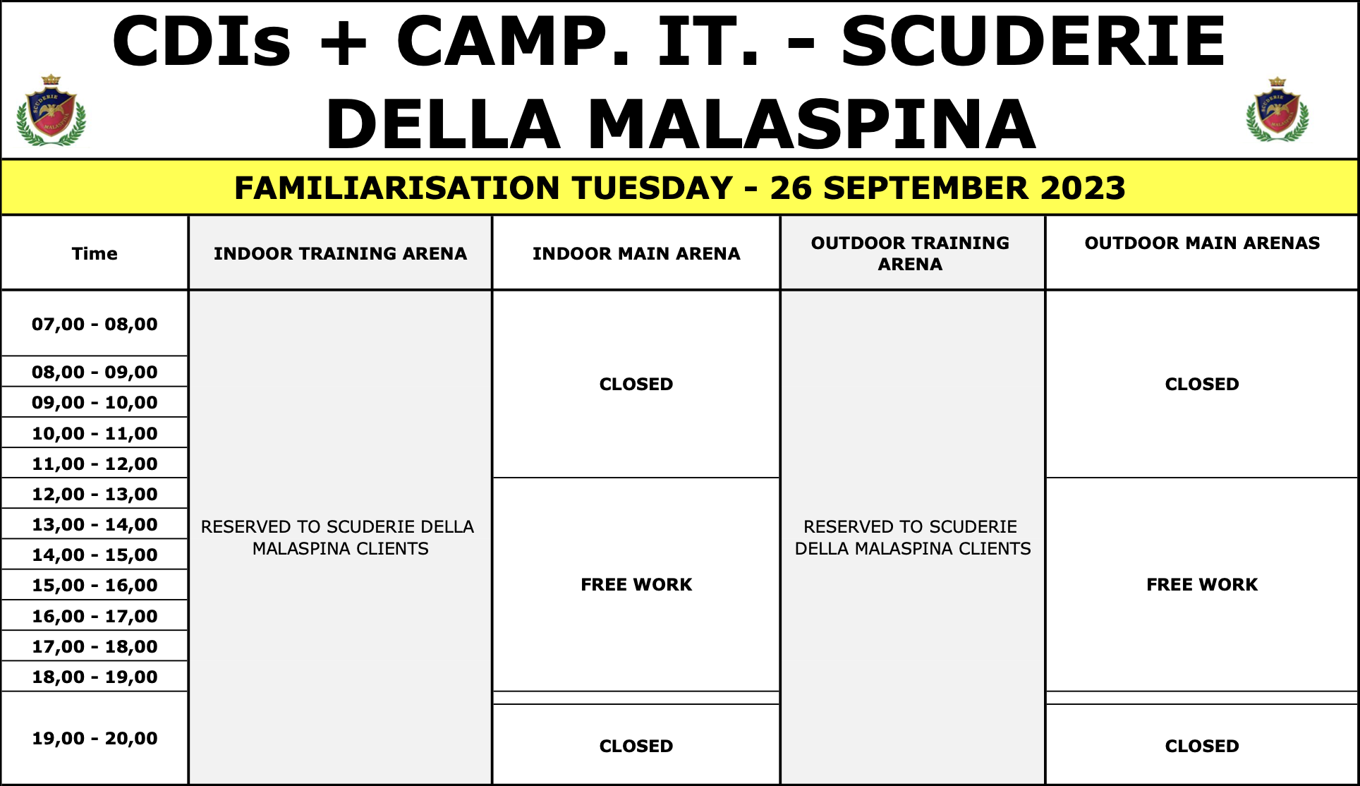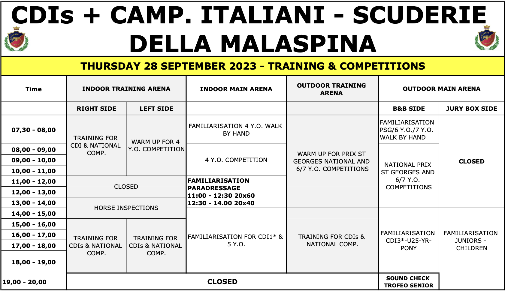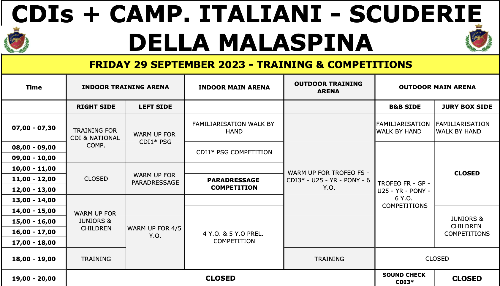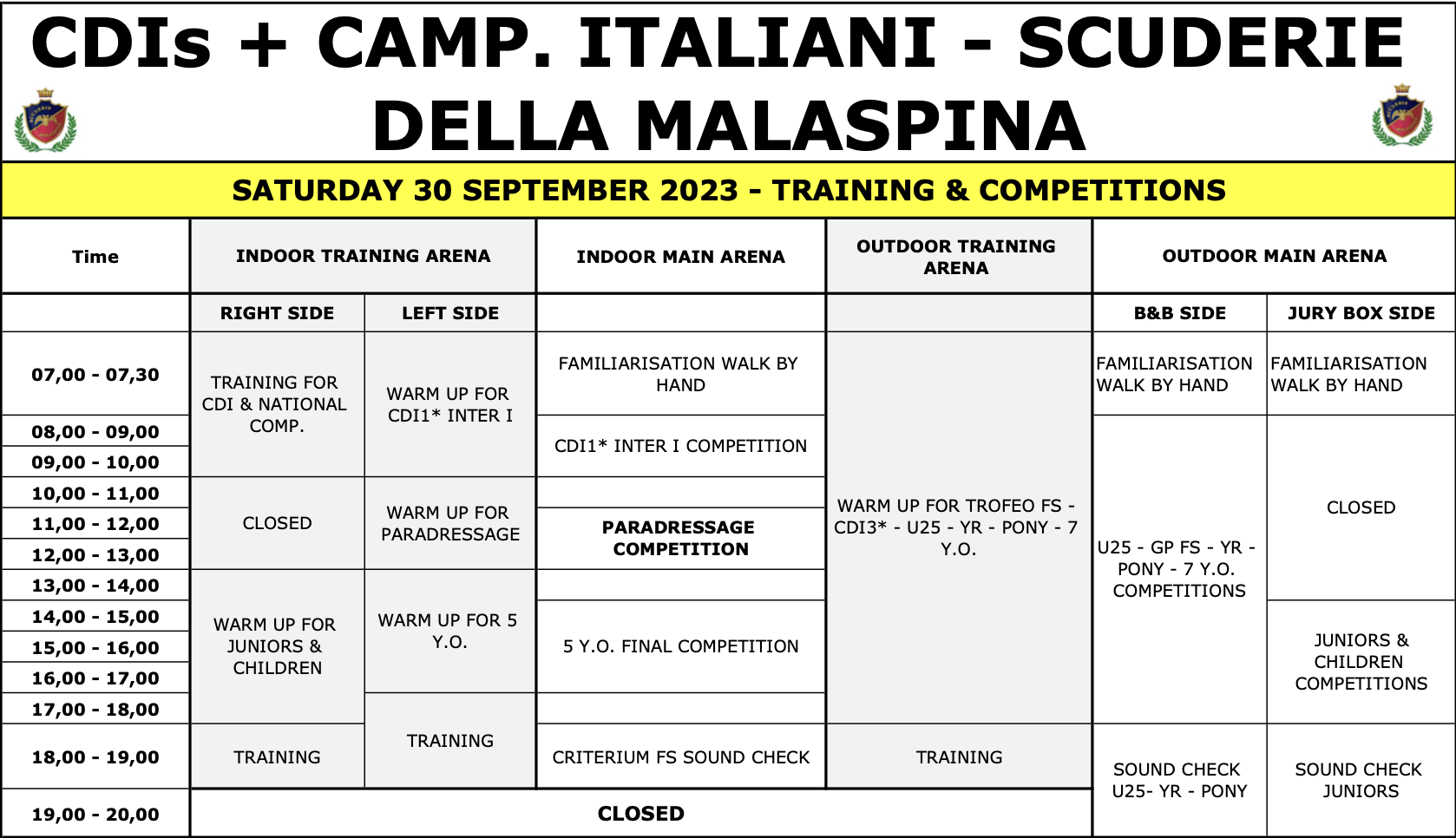 La segreteria prontamente guidata dalla fedelissima CAROLA GIULIANI ha già pubblicato la time-table delle competizioni e l’organizzazione della familiarizzazione e utilizzo campi valevole per tutti i giorni di gare.