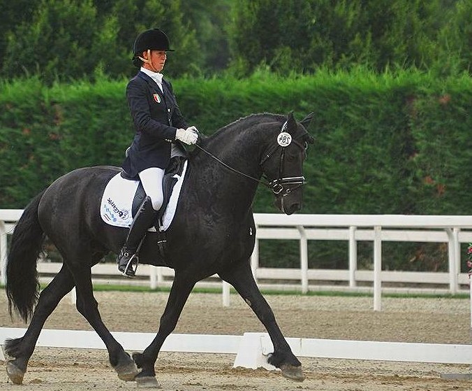 “E’ per me una grande soddisfazione aver dimostrato che anche questi cavalli possono lavorare bene in dressage,” spiega Claudia Montanari, ” purtroppo anche i Frisoni subiscono qualche pregiudizio come una volta i cavalli iberici, una migliore selezione e importazione dimostrano che ci possono essere soggetti validi anche in questa razza…”.