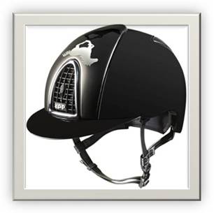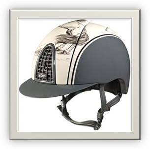 Sembrano un disegno a carboncino i due cavalli che si fronteggiano, con le montagne alle loro spalle, riprodotti sul casco bianco lucido autografato da Cassio Rivetti, campione ucraino di Salto a Ostacoli che ha partecipato alle Olimpiadi di Londra 2012, ai Campionati del Mondo di Aachen 2006 e di Lexington 2010, infine ai Campionati Europei di Windsor 2009.