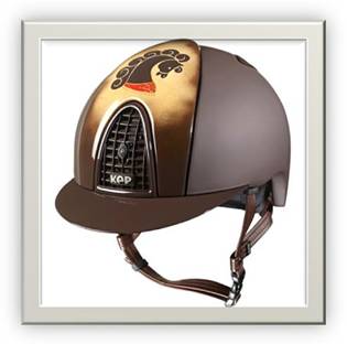 Un cavallo stilizzato di gusto arabeggiante è il protagonista del casco marrone lucido e satinato autografato dal campione italiano in carica di Attacchi Cristiano Cividini.