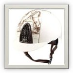 Reca la firma di Filippo Bologni, Campione Italiano Junior Salto Ostacoli 2013, il casco cromo sport nero opaco con parte anteriore lucida dove sono state realizzati, con aerografia, due cavalli, uno nero e uno bianco, ritratti specularmente. Anche sul retro, di fianco all’autografo del campione, altri due cavalli sono ritratti in modo speculare