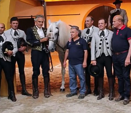 Bocelli è andato a Jerez per visitare le installazioni e assistere allo spettacolo di “ come ballano i cavalli andalusi “ . Si è poi intrattenuto coni jinetes ed ha avuto l’ opportunitá di cavalcare uno dei P.R.E. della scuola sotto gli occhi attenti tra l’ altro di Rafael Soto.