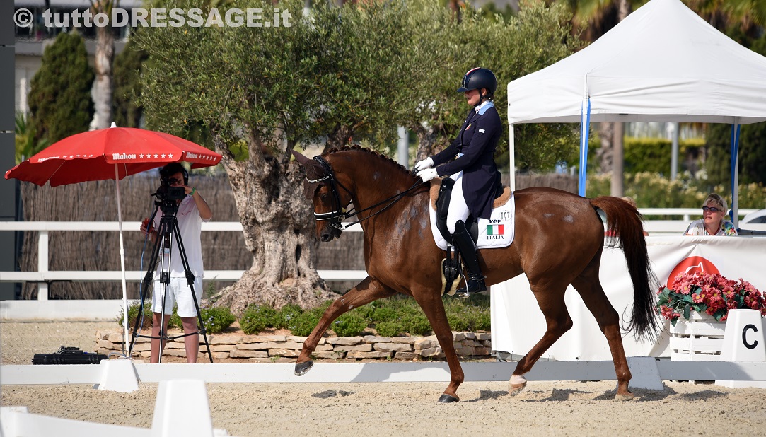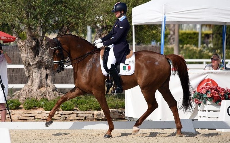 Prova positiva anche per Lucia Berni ed Ebony che con un grafico completamente libero da errori chiudono in ottava posizione con il 68.737%. Si è percepito chiaramente il feeling all’interno del binomio ed il castrone ha risposto con grinta e perfettamente a ogni richiesta dell’amazzone. Leggermente indietro nella fase di trotto iniziale, Ebony si è poi sciolto ed ha mostrato buon passo, galoppo e galoppo rovescio. Discrete le pirouette, meglio i cambi al volo.