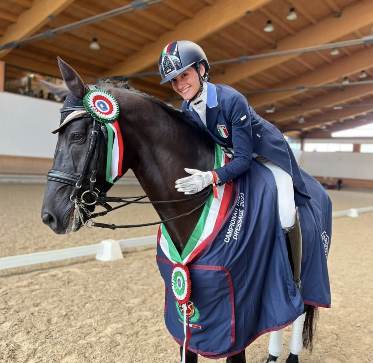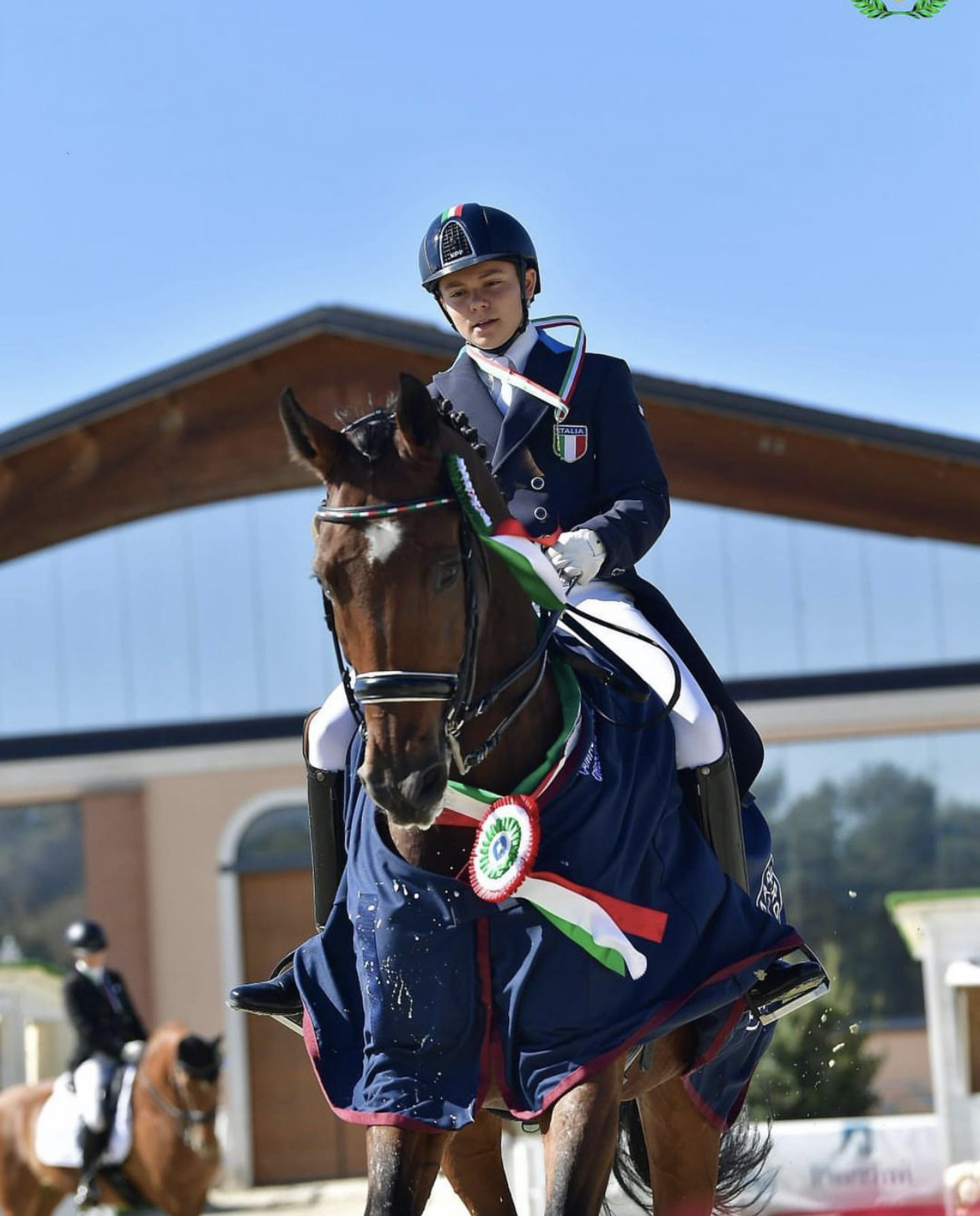 ORO a lui, seguito dal nostro Riccardino Spagni, debuttante in categoria che con il suo compagno di sempre Cesan è riuscito ad aggiudicarsi l’ARGENTO. Il cavallo ha ancora qualche difficoltà nei cambi ma Riccardo ha saputo per tutto il resto della ripresa dimostrare grande maturità tecnica a questo livello. BRONZO per Meattini Serena e il suo Lusitano sauro Horus, reduce dai successi del Campionato Italiano Master Iberico, ha bissato il suo successo a livello nazionale.