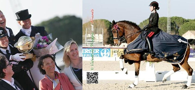 “Oggi abbiamo presentato un nuovo disegno molto più difficile,” ha aggiunto il tecnico soffermandosi sulla Kür, “che prevede tra l’altro anche i cambi tempo-tempo nel circolo. Valentina non è mai contenta e sa che ogni giorno è sempre possibile migliorare la propria performance. Credo che questo sia uno dei suoi punti di forza. Quanto a Eremo è in gran forma e poter lavorare due volte al giorno anche in gara lo rende pieno di energie, di impulso e garantisce continuità nei risultati. Adesso pensiamo a s‘Hertogenbosch, dove tra due settimane ci confronteremo ancora una volta con i big del dressage mondiale”. Conclude Truppa.