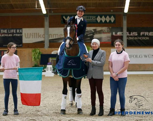 Xenia Herta Schumann da regolamento può scendere con un solo cavallo in campo nel Freestyle e sceglie il più esperto Remidemi con il quale conclude al 6° posto con il 68,400%, torna sul gradino più alto del podio l’ austriaca Victoria Wurziger con Dorian ed il 72,675%.