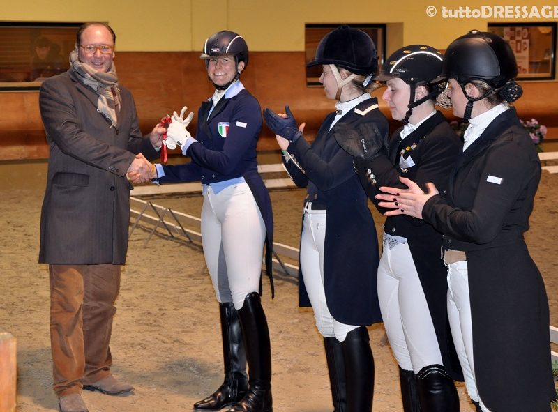 Ancora in luce Arianna Petroncini con Royal Angelo che con un bel 69,430% vince l’ Intermediaire I davanti a Monica Bernardis 65,263% con Hidalgo, terza Caterina Giorgia Lidia Motta (64,167%) con Valentijn. Solitario in Team Test Junior è Filippo Di Marco de Il Cavallino di Rosate che con il 65,135% è bravo a guadagnarsi la prima qualifica internazionale con il suo nuovo cavallo Anava Welt.