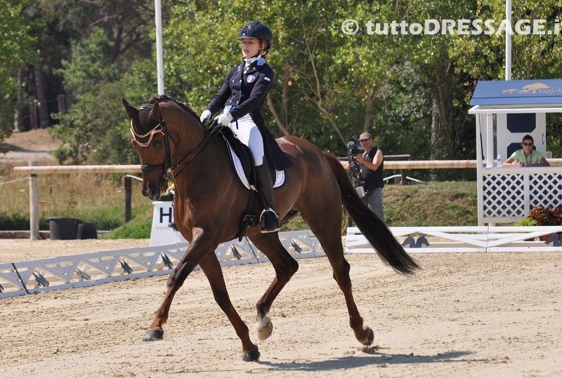 Certamente sarà stato emozionante per Ginevra Coperchio essere la prima ad entrare nell’arena in un evento di tale importanza e risonanza mediatica. E sappiamo tutti che, spesso, è proprio quella sanissima emozione a procurare guai nel rettangolo di gara. Non è questo il nostro caso. Ginevra Coperchio e l’imprevedibile Hilltop Don Rodrigo, per gli amici “Ghigo”, hanno abbandonato i fuorvianti sentimenti prima dell’ingresso sulla center line per il saluto ed insieme hanno prodotto una bellissima performance dall’inizio alla fine. Il punteggio finale di 67.676% permetterà loro di rimanere nella prima metà della classifica.