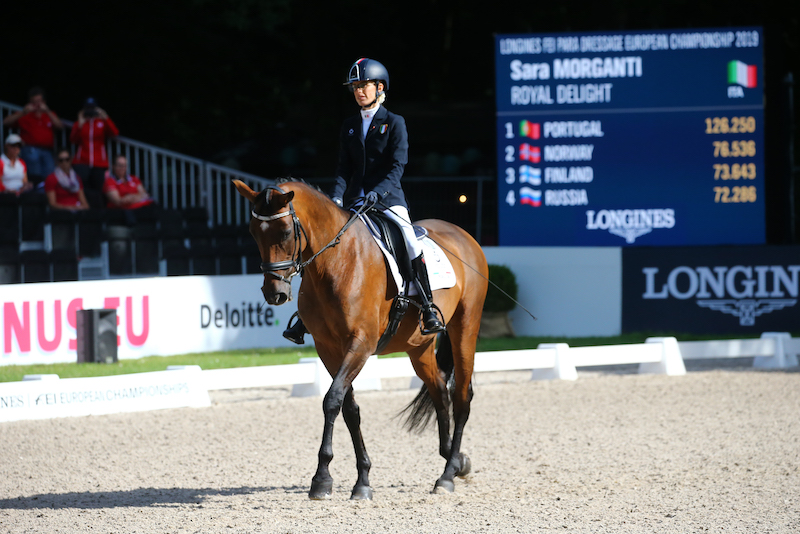 Prima giornata di Team test a Rotterdam in Olanda per i Campionati Europei di Paradressage. Dopo la bellissima medaglia d’argento continentale, la Campionessa del Mondo in carica Sara Morganti insieme alla fantastica Royal Delight sono state ancora una volta protagonista di una prova fantastica. Per loro punteggio percentuale del 74,750, che è valso la seconda posizione del grado I. Nella stessa gara sfiora ancora il 70% Carola Semperboni, all’esordio in un Campionato Internazionale, in sella a Paul. L’amazzone azzurra ha chiuso, infatti, in ottava posizione con il 69,607%.
