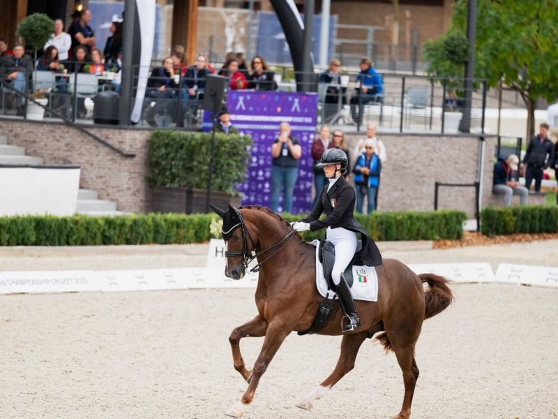 L’avventura azzurra si è conclusa con il Grand Prix di giovedì, valido sia per la classifica a squadre che per la qualificazione individuale (riservata ai migliori 30). La ripresa di Nathalie e Scorpion è valsa la 41ª posizione con la percentuale del 67,857%. Una prova pulita e solida, con un trotto valutato intorno al 68-69%, ma compromessa da un errore nei tempi tempi che ha impedito l’accesso alla top 30. Un risultato comunque di grande orgoglio, come lei stessa ha raccontato sui social:
