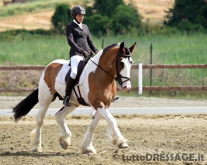 Diciamolo chiaramente, non capita proprio tutti i giorni di vedere in rettangolo un robusto Irish Tinker pezzato e con i caratteristici ciuffi muoversi elegante in un rettangolo da dressage.