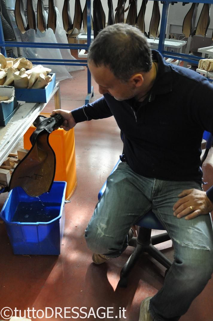 Lo stivale viene immerso nell’acqua in modo che si possa lavorare, viene messa la forma in legno e viene lavorato su di essa. In questo modo una volta messo in forno si plasma sulla forma, poi si lascia su di essa 2 o 3 giorni , il tempo di asciugatura.