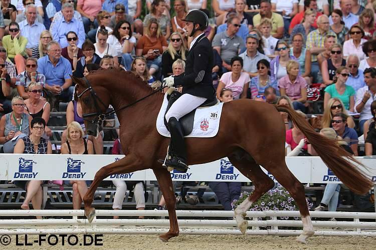 Presentato da Pascal Kandziora, Destacado (allevatore: Heinrich Gießelmann, Barver), un figlio di Desperados FRH che a Rio è stato vincitore sotto la sella di Kristina Bröring-Sprehe di un oro ed un bronzo, ha dominato la divisione più giovane a Warendorf ottenendo la medaglia d’oro nella divisione riservata agli stalloni di tre anni.