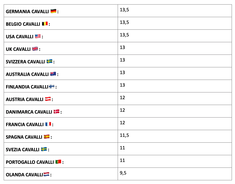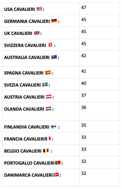 A primo impatto quello che possiamo notare dalle tabelle è che: paradossalmente le nazioni più ‘anziane’ ossia con età media dei cavalieri più alte sono anche quelle che hanno i cavalli con l’età media più avanzata e di conseguenza le squadre più giovani sono quelle con i cavalli con l’età media più bassa.
