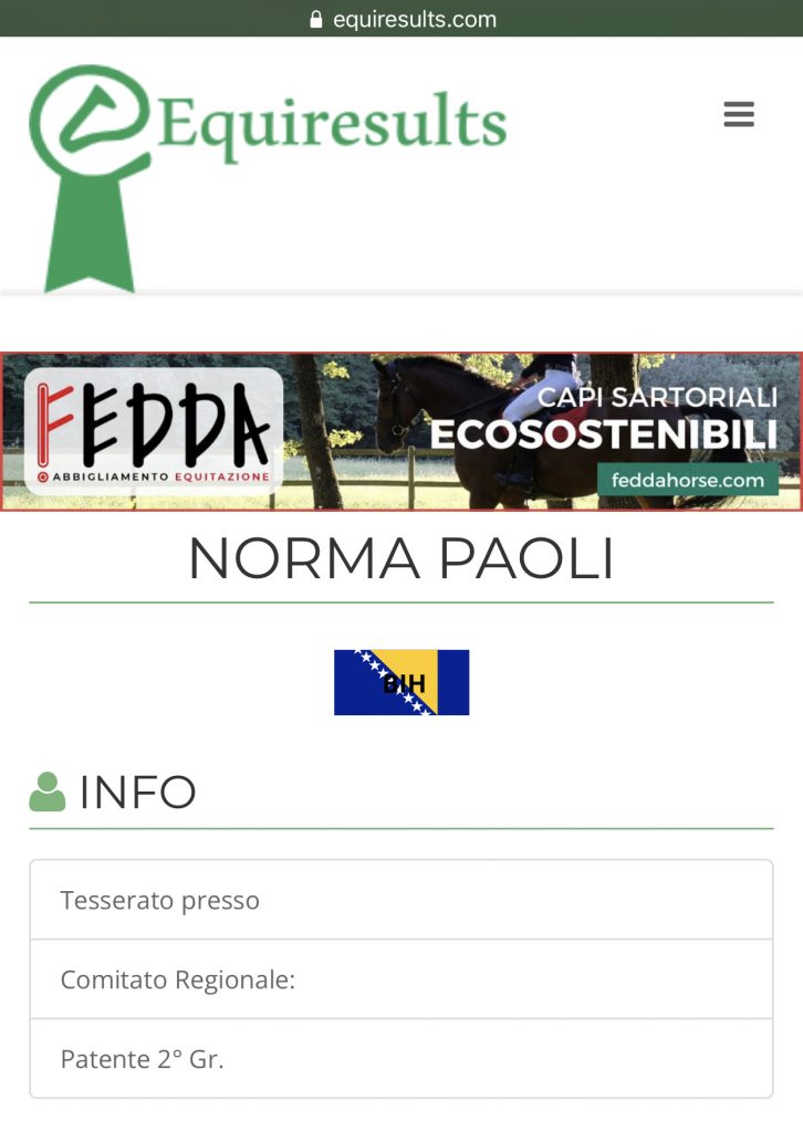 È comparsa per pochissime ore sul sito Equiresults questa bandiera Bosniaca accanto all’amazzone Norma Paoli.Errore della segreteria oppure qualcosa bolle in pentola e c’è nell’aria un cambio di nazionalità per avvicinarsi con più facilità agli appuntamenti importanti???Nessuno ci ha dato spiegazioni….. vedremo cosa accadrà…..