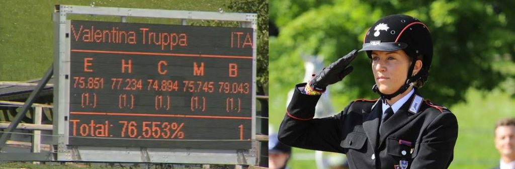 CDI 4* Fritzens – Grand Prix qualifying for GP Freestyle : 1° Valentina Truppa (Italy) – Fixdesign Eremo del Castegno 76.553% 2° Dorothee Schneider (Germany) – Keiserkult 71.851% 3° Tina Konyot (USA) – Calecto 70.766% 4° Matthias Kempkes (Germany) – Riccoletto 70.021% 5° Claire Gosselin (France) – Karamel de Lauture 68.681% 6° Hannah Biggs (Great Britain) – Weltzin 68.489% 7° Micol Rustignoli (Italy) – Corallo Nero 67.936% 8° Borja Carrascosa Martinez (Spain) – PSI de Caprio 67.894% 9° Caroline Haecki Rindlisbacher (Switzerland) – Rigoletto Royal 67.723% 10° Elena Sidneva (Russia) – Romeo Star 67.574% 11° Martin Hauptmann (Austria) – Frechdachs 67.383% 12° Stefanie Weihermueller (Germany) – Fantomas 67.319% 13° Pierre Subileau (France) – Talitie 66.553% 14° Max Wadenspanner (Germany) – Bandor 66.511% 15° Belinda Weinbauer (Austria) – Debut Dallas 66.128% 16° Evelyn Haim Swarovski (Austria) – Dorina 66.000% 17° Sonja Sprenger (Germany) – Night Moon 65.362% 18° Amanda Hartung (Austria) – Wolkenritter 65.277% 19° Bianca Kasselmann (Germany) – Destination 63.255% 20° Sina Waldmeier (Switzerland) – Kavarell 62.277% 21° Monica Iemi (Italy) – Ramanaz 61.872% 22° James Connors (Ireland) – Shenandoah 61.340%