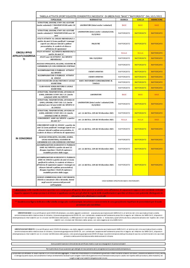 Ecco la tabella delle attività e necessità di GREEN PASS “BASE”/RAFFORZATO consentite dal 10 Gennaio 2022 per gli sport equestri.