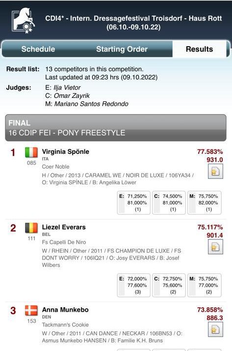 Ottima la prestazione di Virginia ed il suo pony che fanno suonare l’inno di Mameli per tre giorni di seguito. Percentuali davvero notevoli per il binomio che ad ogni concorso riesce sempre a migliorarsi, affermandosi tra i più forti d’Europa. Era 15esima nella ranking prima di questa gara, sicuramente avrà uno scatto in avanti nella classifica.