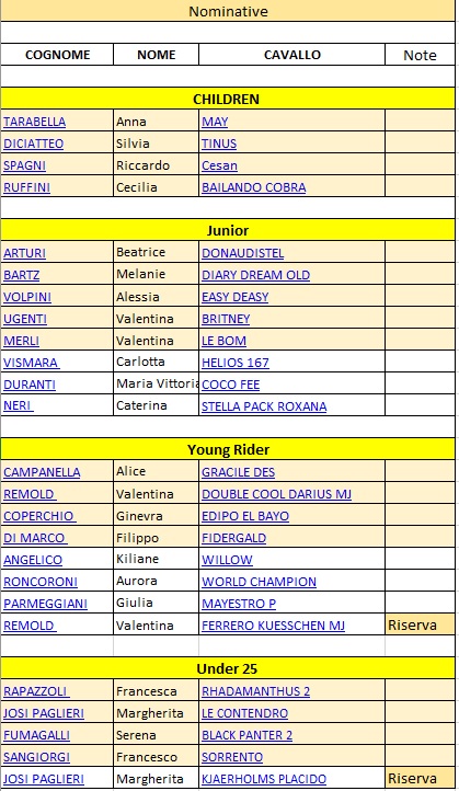 Per Junior e Young Riders, come potete leggere dalla tabella che segue, sono otto i binomi iscritti alle nominative da cui entro il 16 luglio verranno scelti ed iscritti definitivamente i quattro binomi che scenderanno in rettangolo con la squadra nelle rispettive categorie più le riserve.